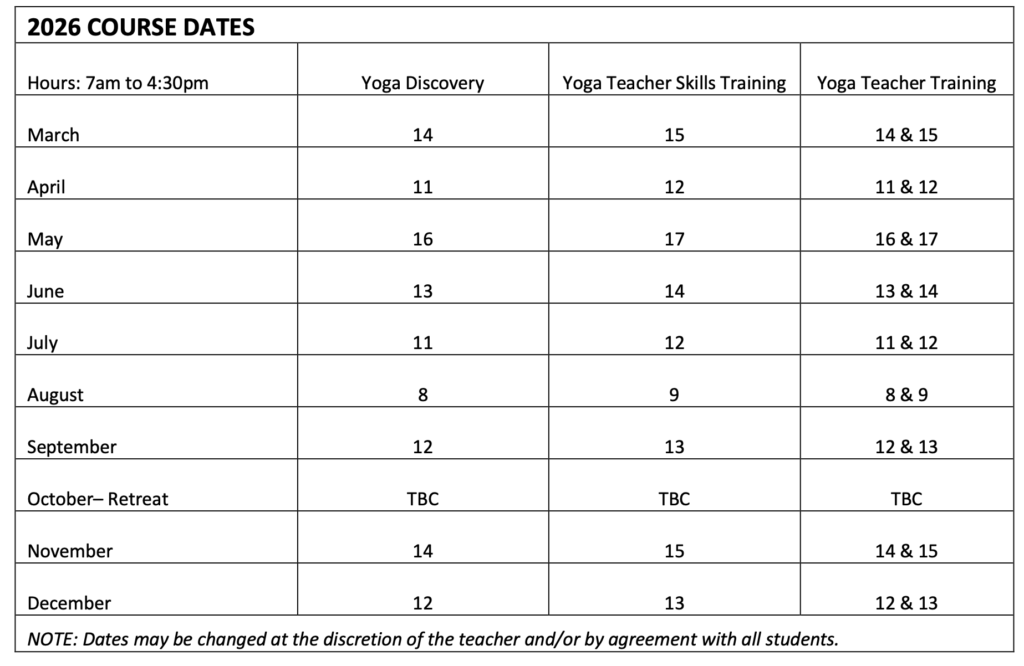 This Yoga Teacher Skills Training course commences mid March 2026 and ends in December. The commitment is 1 Sunday per month for nine months, plus a 5-day residential retreat in September/October (date to be confirmed).